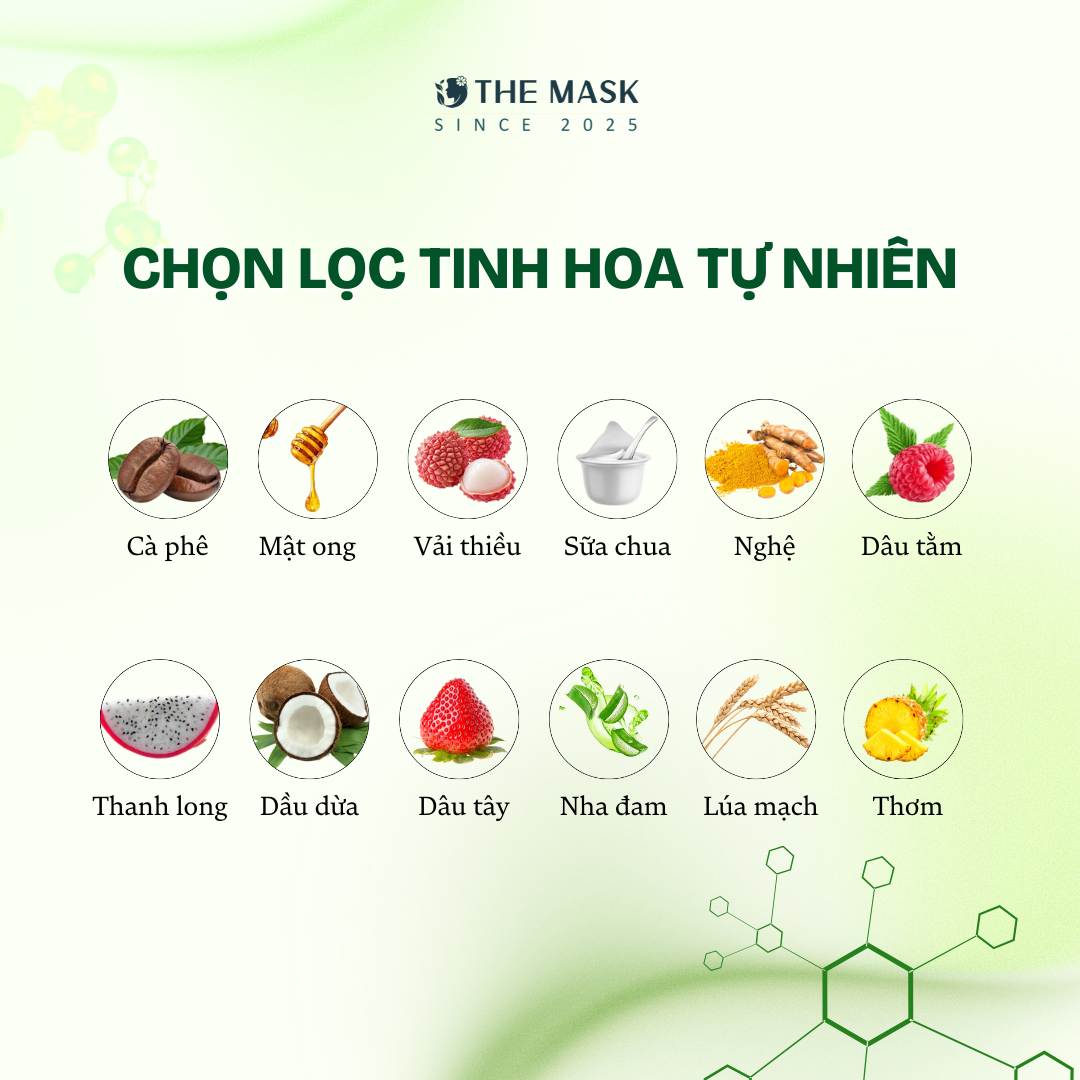 Mỗi miếng mặt nạ The Mask là một món quà từ thiên nhiên. Tất cả đều không hương liệu tổng hợp, không chất bảo quản mạnh, và đặc biệt an toàn cho cả làn da nhạy cảm.